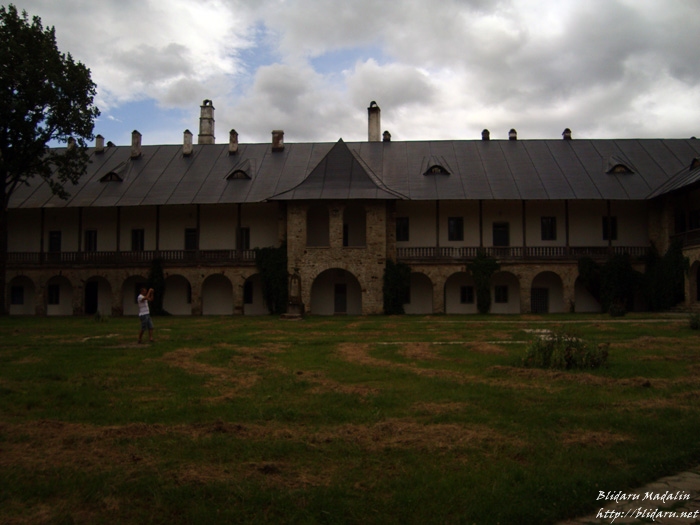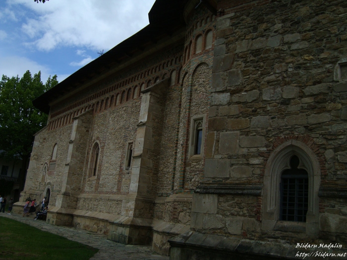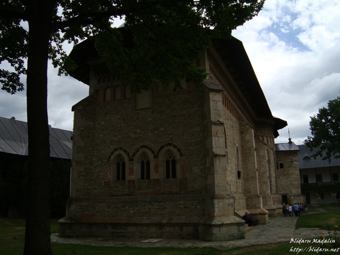 “Biserica ctitorită de Ştefan cel Mare este principalul monument istoric şi de arhitectură moldovenească din incinta mânăstirii, de o eleganţă şi frumuseţe deosebite. Dimensiunile si monumentalitatea ansamblului au sporit prin introducerea în construcţie a unor elemente noi: pridvorul, situat în faţa intrării şi sala mormintelor, sau gropniţa, amplasata între pronaos şi naos.
